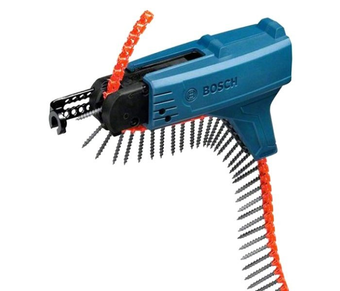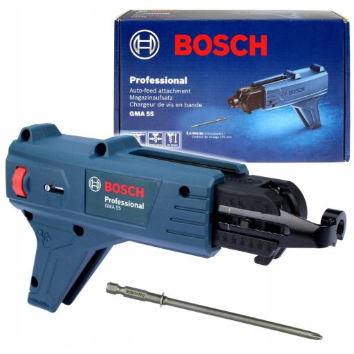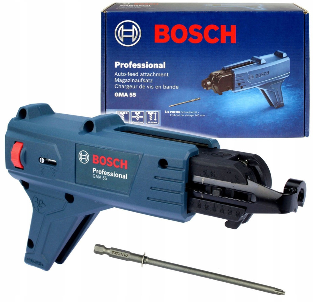 A GMA 55 tartozék legfeljebb 5 mm átmérőjű és 25 és 55 mm közötti hosszúságú gipszkartoncsavarokhoz alkalmas. Erősségei az ismétlődő feladatokban, például a gipszkarton panelek mennyezetre rögzítésében mutatkoznak meg. A GMA 55 kompatibilis az összes Bosch Professional gipszkarton csavarbehajtóval legyen az akkus, vagy hálózati.Például a GTB 18V-45, GTB 12V-11 vagy a GSR 18 V-EC TE modellekkel.