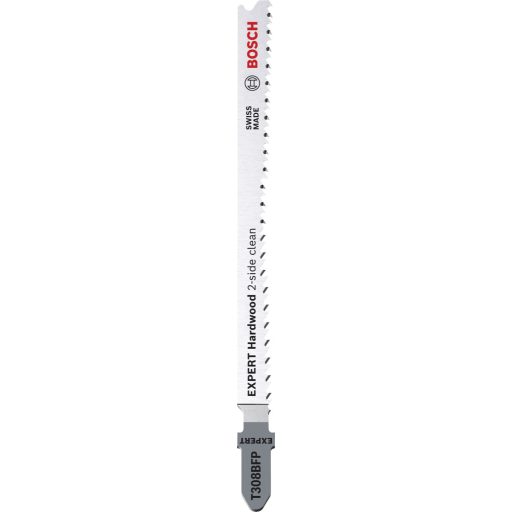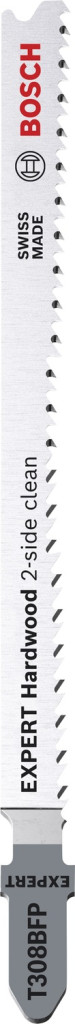 A bimetálból – hajlékony acélpengéhez ragasztott gyorsacél szalag, egyesítve az erőt és a hajlékonyságot – készült Bosch EXPERT Hardwood 2-side clean szúrófűrészlap kellően robusztus laminált faforgácslapból készült konyhai munkalapok vagy keményfa vágásához. Kapható szakadásmentes egyenes vágásokhoz (T308BF) és különösen pontos, szakadásmentes ferde és íves vágásokhoz (T308BFP).