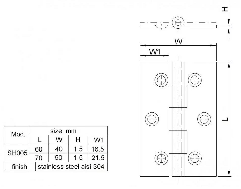 Rozsdamentes ajtózsanár (csuklóspánt) 60x40x1,5mm