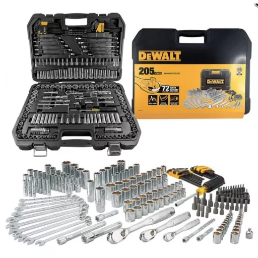 A DEWALT® 205 darabos mechanikus szerszámkészlet két körtefejű racsnival, különféle foglalatokkal, hosszabbítókkal, univerzális csuklókkal és adapterekkel, valamint tartós tokban érkezik, fémreteszekkel a nagyobb biztonság érdekében. A 72 fogszámú racsnis gyorskioldó gombbal van felszerelve a foglalat könnyű csatlakoztatásához vagy eltávolításához. A foglalatok DirectTorque™ technológiát tartalmaztak, amely megakadályozza a rögzítők lekerekítését és jobb fogást biztosít.