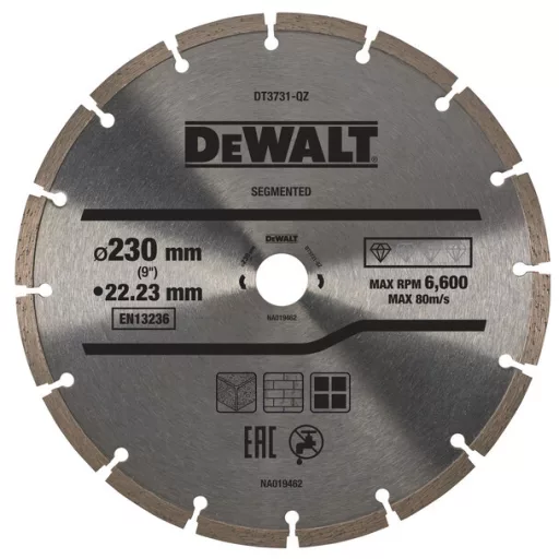 Nagy teljesítményű szegmentált tárcsa általános építőanyagok, például építőelemek, térkövek és beton gyors vágásához. 230 mm átmérő.