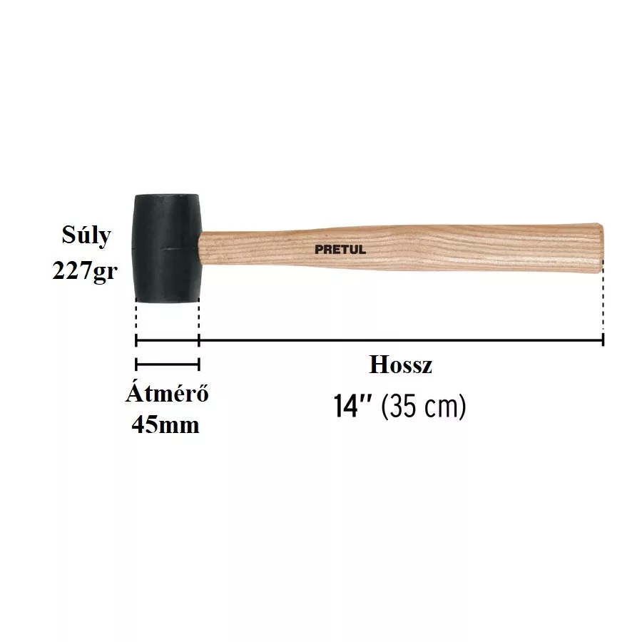 Gumikalapács, 44mm széles fej (fekete), lakkozott fa nyél, 35cm hosszú, teljes súly: 450gr (nyéllel együtt), PRETUL