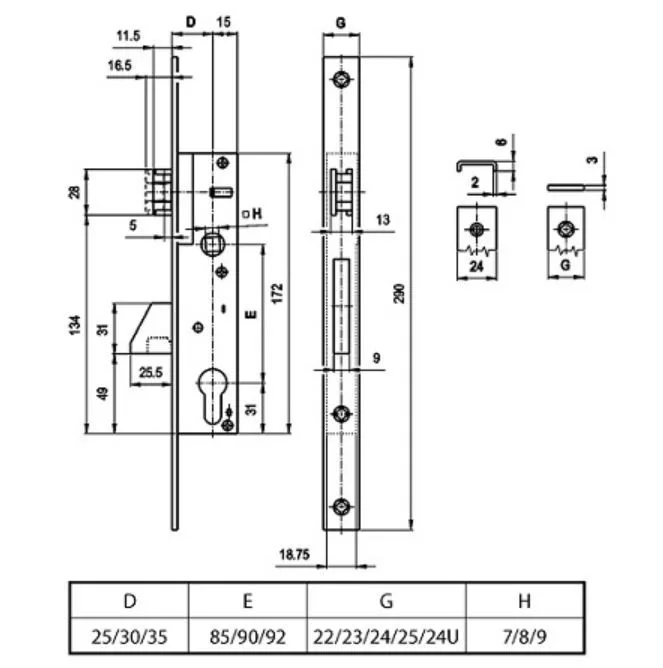 Portálzár 40-[] Billenőnyelves 25/85/290/24/8 40mm - EURO ELZETT (kilincses)