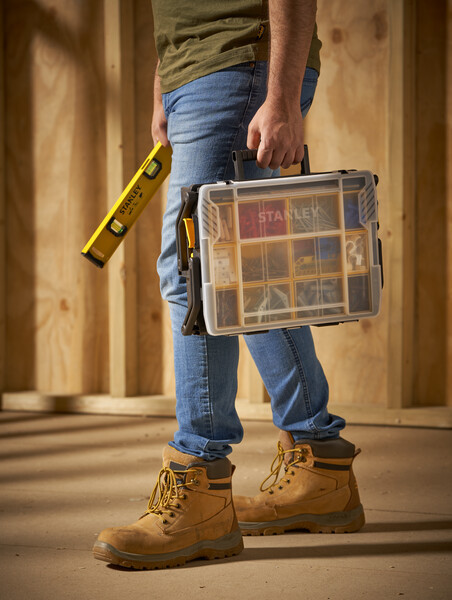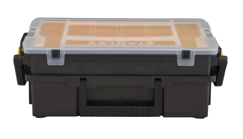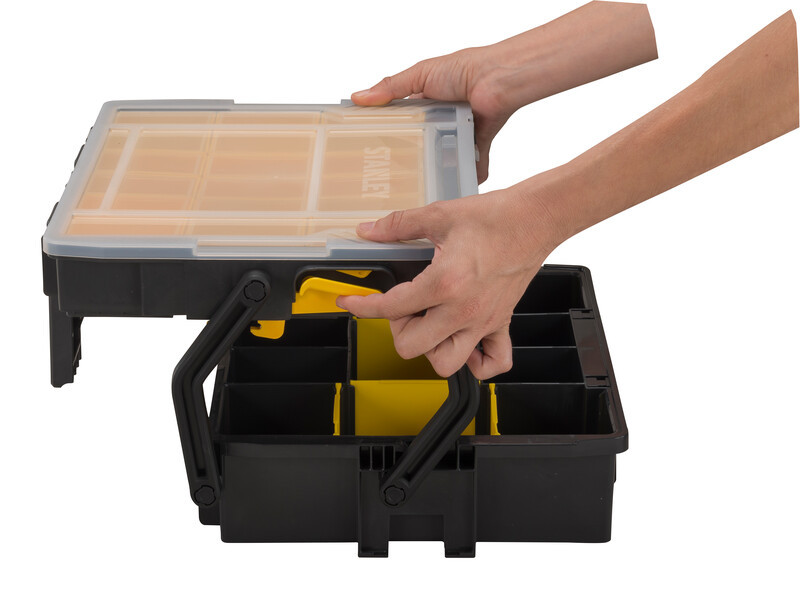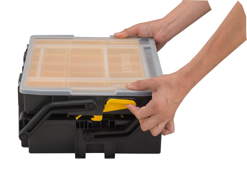 A STANLEY® SORTMASTER® többszintes szortimenter 2 tárolószinttel rendelkezik a kis alkatrészek, alkatrészek és kisebb szerszámok rendszerezéséhez. A felső szinten 16 kivehető rekesz található a kis alkatrészek rendszerezéséhez, míg az alsó szinten kivehető elválasztók találhatók, amelyek szintén lehetővé teszik a kisebb szerszámok tárolását. Az átlátszó fedél teljes rálátást biztosít a tartalomra, és úgy van kialakítva, hogy az elválasztókhoz illeszkedjen, megakadályozva a tartalom kiömlését és más rekeszekbe való keveredését. A hasonló STANLEY® SORTMASTER® szortimenterek összecsatolhatók, és a texturált fogantyúval hordozhatók.