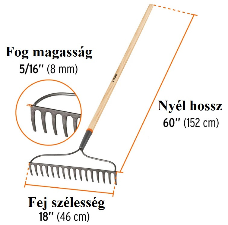 Gereblye, 16 fog, 46cm széles kovácsolt fej, teljes hossz: 152cm