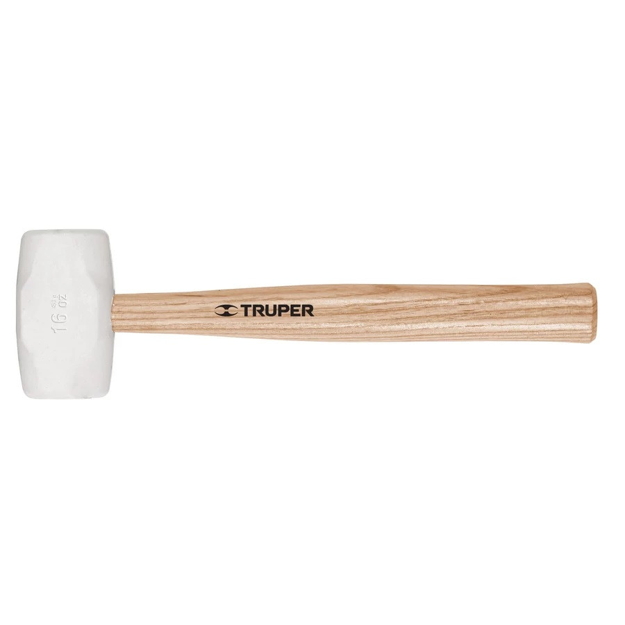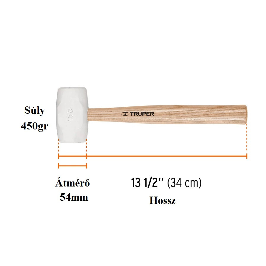 Gumikalapács, 48mm széles fej (fehér), lakkozott fa nyél, 34cm hosszú, teljes súly: 600gr (nyéllel együtt)