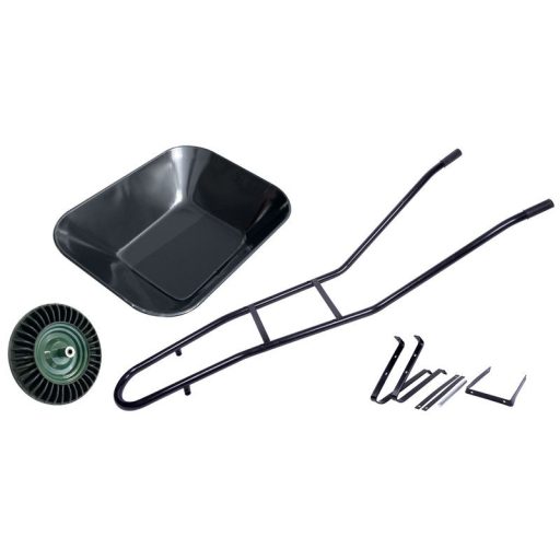 A kemény és széles tömör kerékkel ellátott talicska különféle kerti vagy építkezési célokra alkalmas. A test fekete védőfestékkel ellátva. Puttony térfogata: 60 liter
