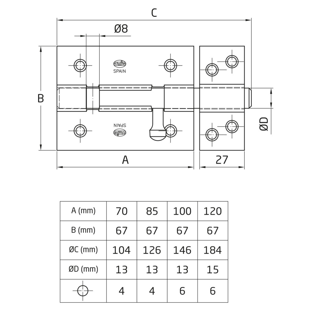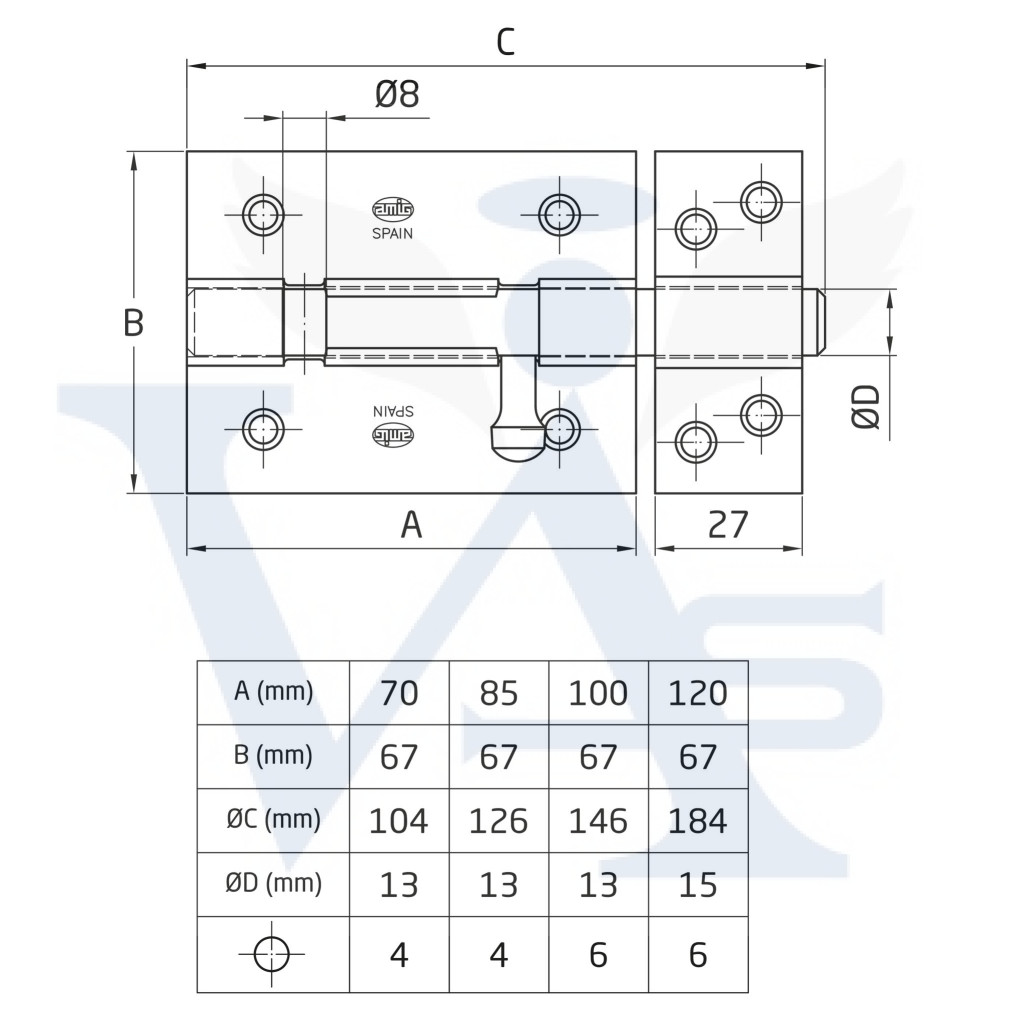 Tolózár. Ø8 mm-es lakatfurattal. Könnyen felszerelhető. Csavarokkal rögzíthető. Egyszerűen és hatékonyan növeli ajtói biztonságát.