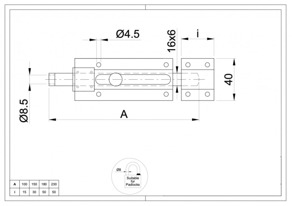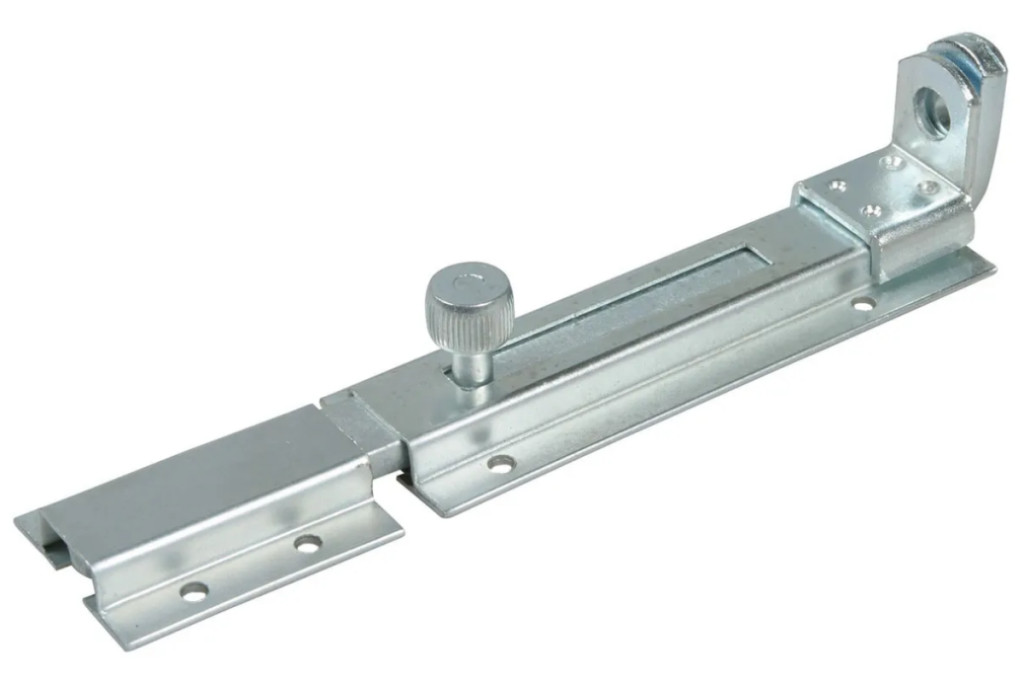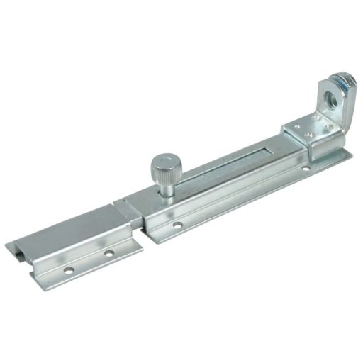 Biztonsági tolózár, fogadó elemmel és látható rögzítőfuratokkal, csavarozható. Széles használhatóság, fiókok, szekrények, nyílások vagy ajtólap zárására használható. Fára, alumíniumra vagy fémre csavarozható, illetve fém felületekre hegeszthető.A működést a rúd működtetése biztosítja. A záródás stabilitását a rejtett rugó biztosítja, amely a zárórudat a helyén tartja. A fokozott biztonság érdekében lakat (max. Ø8 mm-es kengyellel) rögzíthető a zárra. A termék bármilyen szerelési vagy rögzítő tartozék (például: csavarok) nélkül kerül szállításra.