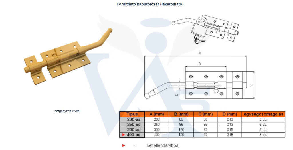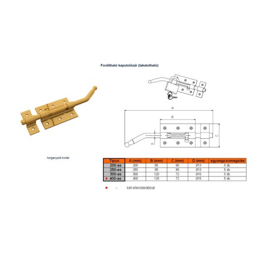 Tolózár 400mm BAJONETT Kapu FORDÍTHATÓ - MAGYAR