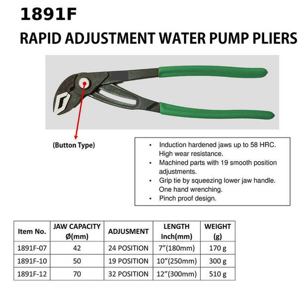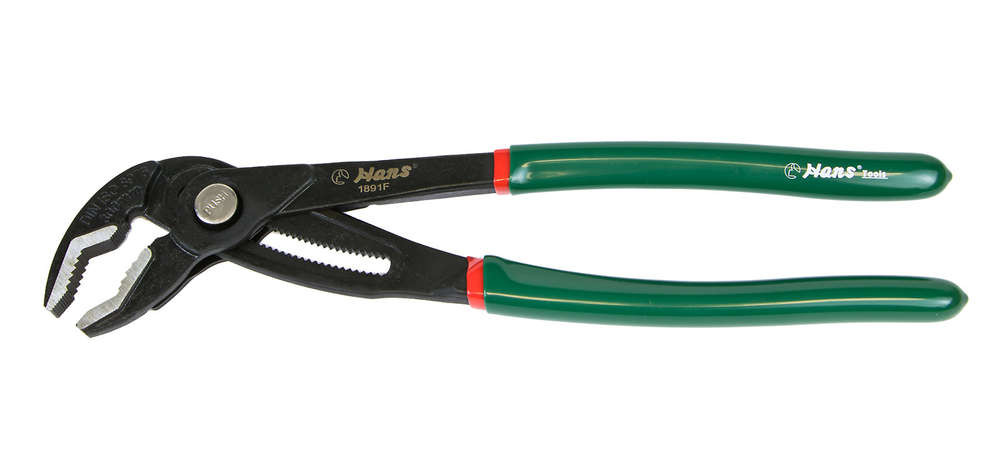 Vízpumpafogó 180mm nyomógombos HANS - Kovácsolt acél, zöld plasztik-nyél (1891F-07)