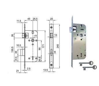 Kulcsos bevésőzár. Beltéri fa ajtókhoz ajánlott.Kilincsek, pajzsok széles körben használhatók (felerősítő lyukak DIN szerint).Univerzális csapdájú, a csapda átfordítható az ajtó nyitásirányának megfelelően.